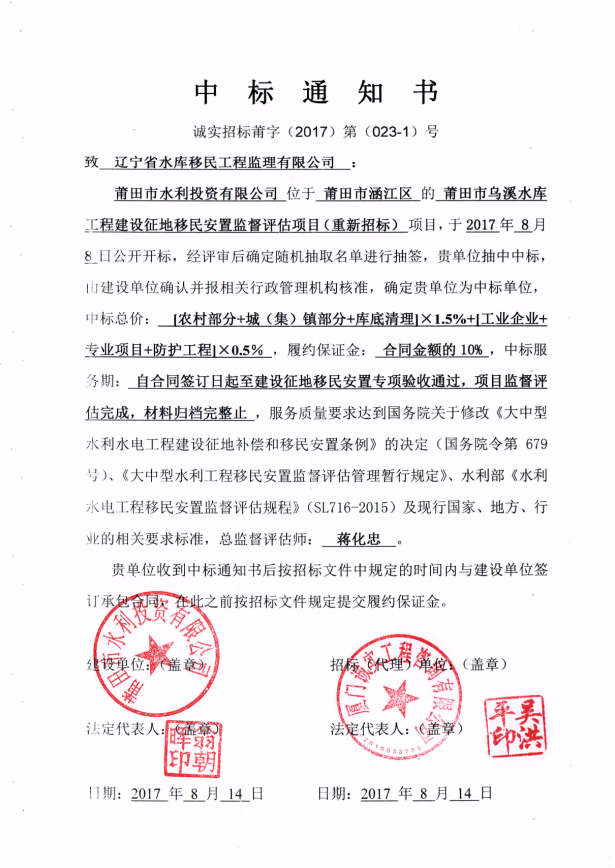 遼寧省水庫移民公司中標莆田市烏溪水庫工程建設(shè)征地移民安置監(jiān)督評估項目...