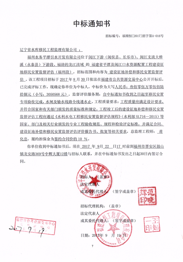 遼寧省水庫移民公司中標福建省平潭及閩江口水資源工程建設(shè)征地移民安置監(jiān)督評估(福州段)...