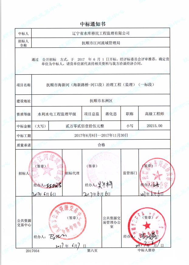遼寧省水庫移民公司中標撫順市海新河(海新路橋-河口段)治理工程一標段